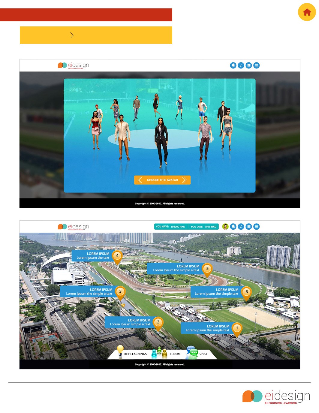 The overall game involves a gating strategy in the learning path allowing the learners to apply what they have learned in each section.