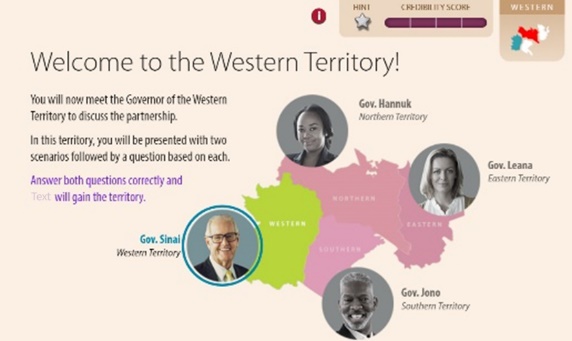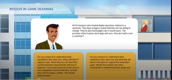 This strategic gamified simulation immerses sales teams in a fictional territory acquisition scenario, challenging them to employ effective influencing strategies. Participants earn points by successfully completing challenges, ultimately securing the territory. Learning content is seamlessly integrated through targeted hints and personalized feedback, providing just-in-time support. This platform is ideal for developing advanced influencing skills in sales professionals navigating complex sales environments.