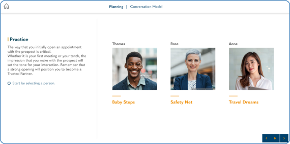 This Perform-to-Learn sales development simulation, grounded in the Holden IV Stage Model, offers a comprehensive and personalized learning journey. Featuring multiple learning components, performance reports, and in-depth analytics, it empowers sellers to hone their skills. Through an engaging challenge game, participants gather incentives and points, gaining valuable insights into their selling style and identifying key areas for growth to achieve the 'Sales Guru' status.