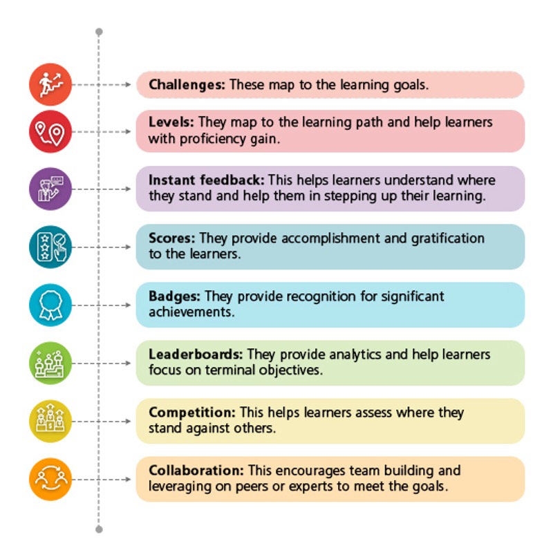 Gamification involves applying the principles and key elements of gaming to achieve specific learning objectives. The key elements of the Game mechanics that are a part of Gamification for learning include:
