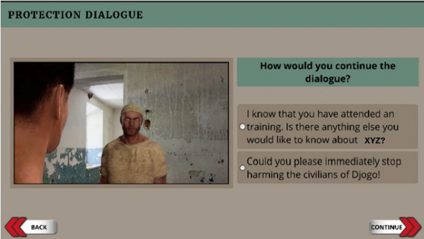 An AI Roleplay solution was recommended, a cutting-edge technology that creates structured conversation scenarios for dialogues with NSAGs. This branching roleplay approach helps avoid unplanned responses, allowing workers to practice realistic simulations. Participants engage with NSAG inquiries, honing skills to efficiently communicate humanitarian goals in a non-threatening manner.
