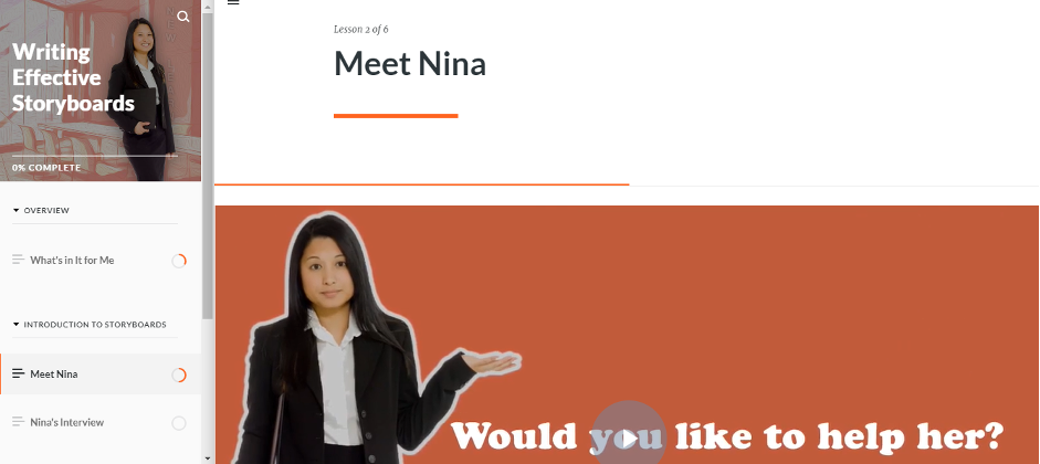 This is an example of a mobile-first course, which uses the narrative of a character called “Nina” who is an Instructional Designer. The entire course follows her journey, and in the process, learners pick up the required skills to create effective storyboards.