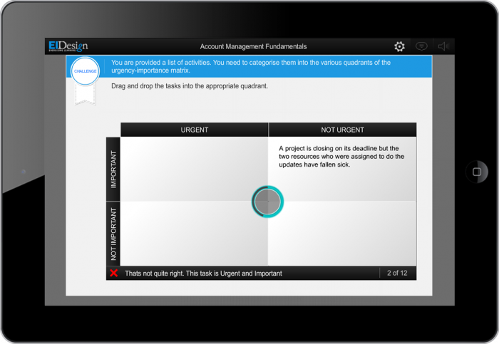 This screen featuring Drag and Drop interaction is a variant on the default template available with Adobe Captivate. We have: