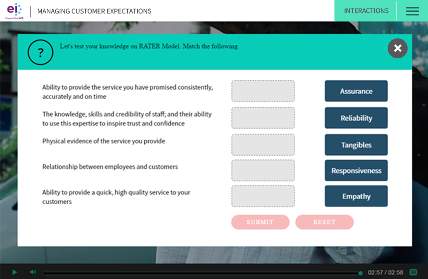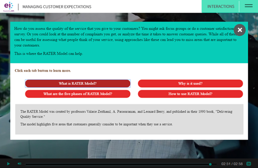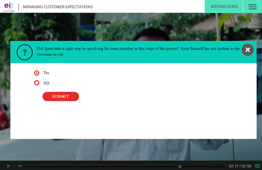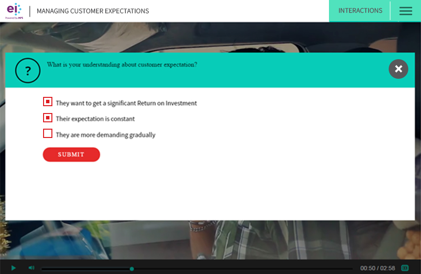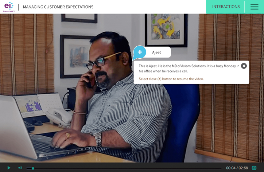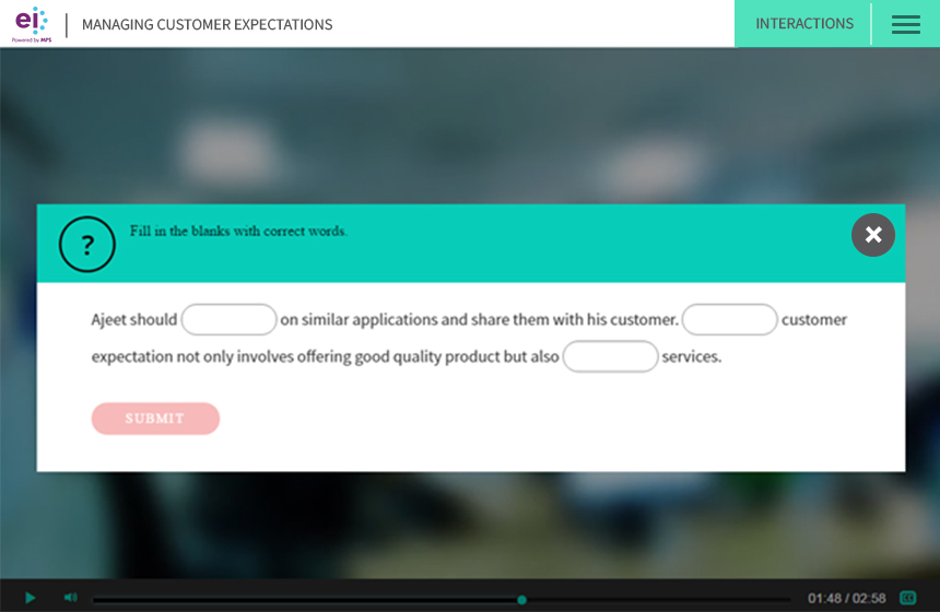 At EI, we have created a customizable interactive video framework that allows us to integrate learning interaction levels that closely mimic the interactions of a traditional eLearning or mLearning course. In contrast to the several online solutions, our framework provides a highly interactive solution, which: