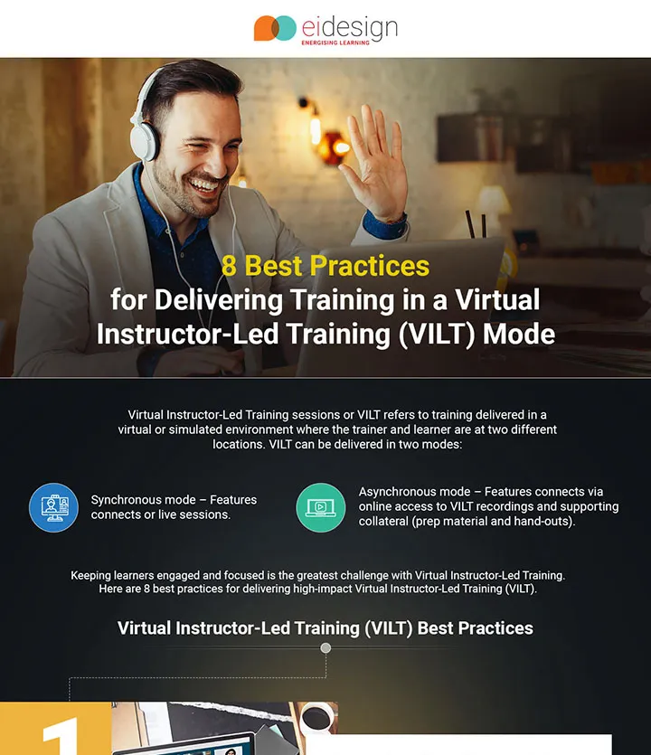 To help you manage this transition to remote learning, take a look at this Infographic where we share Virtual Instructor-Led Training best practices you can adopt as you gradually transform your classroom/ILT training to the Virtual Instructor-Led Training (VILT) mode – delivered in the Synchronous or Asynchronous mode.