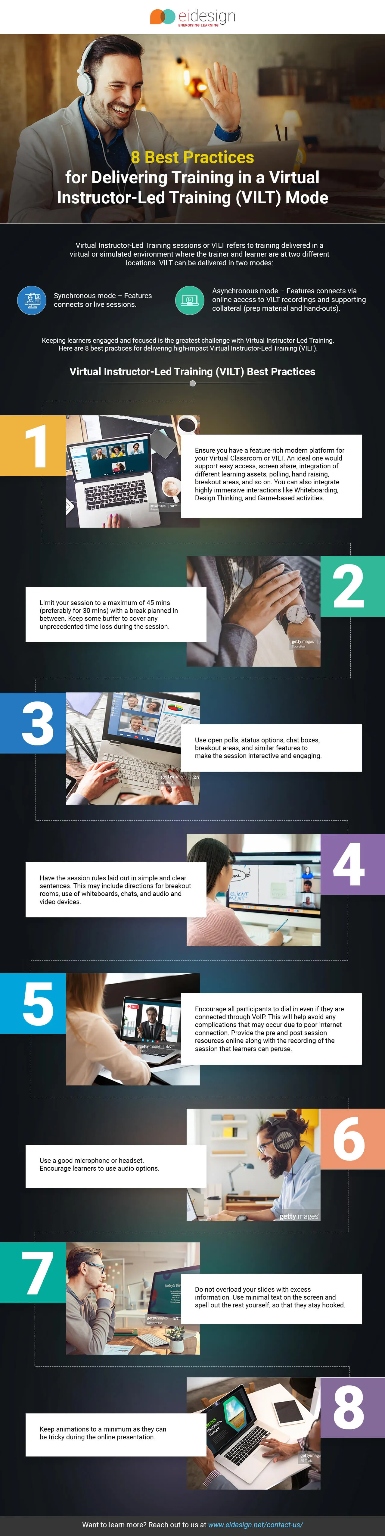 We are sure that this Infographic will give you the required cues on how you can use the 8 Virtual Instructor-Led Training best practices as you transform your classroom/ILT training to an engaging Virtual Instructor-Led Training (VILT) mode.