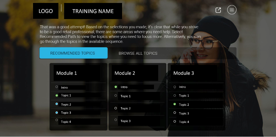 A leading runner in the tobacco industry recognized that its sales agents required thorough product knowledge to increase their lead generation. To address varying levels of experience among the agents, we implemented a pre-assessment at the start of each module. This assessment gauges their current proficiency levels and learning preferences. Based on their scores and preferences, we tailored topic recommendations to personalize their learning journey. This approach enables learners to efficiently access pertinent information while also offering opportunities to explore additional topics of interest.