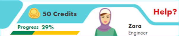 Progress Bar/Credits: The top bar of the course was designed to accommodate the progress bar and the credits earned within each module. These features helped learners track how far they were in each module and the number of credits needed to be earned to unlock the next module which led to focused learning. This is particularly useful for games of such duration and also adds to the user experience.