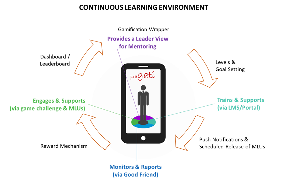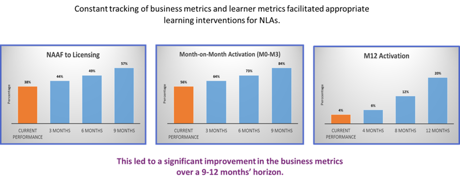 The app was integrated with the NLAs’ business performance tracking systems and accordingly kept pushing content (MLUs, games, simulations) on the basis of their business performance. Impact: Constant tracking of business metrics and learner metrics facilitated the appropriate learning interventions for the NLAs. This led to a significant improvement in the business metrics over a period of 9- 12 months