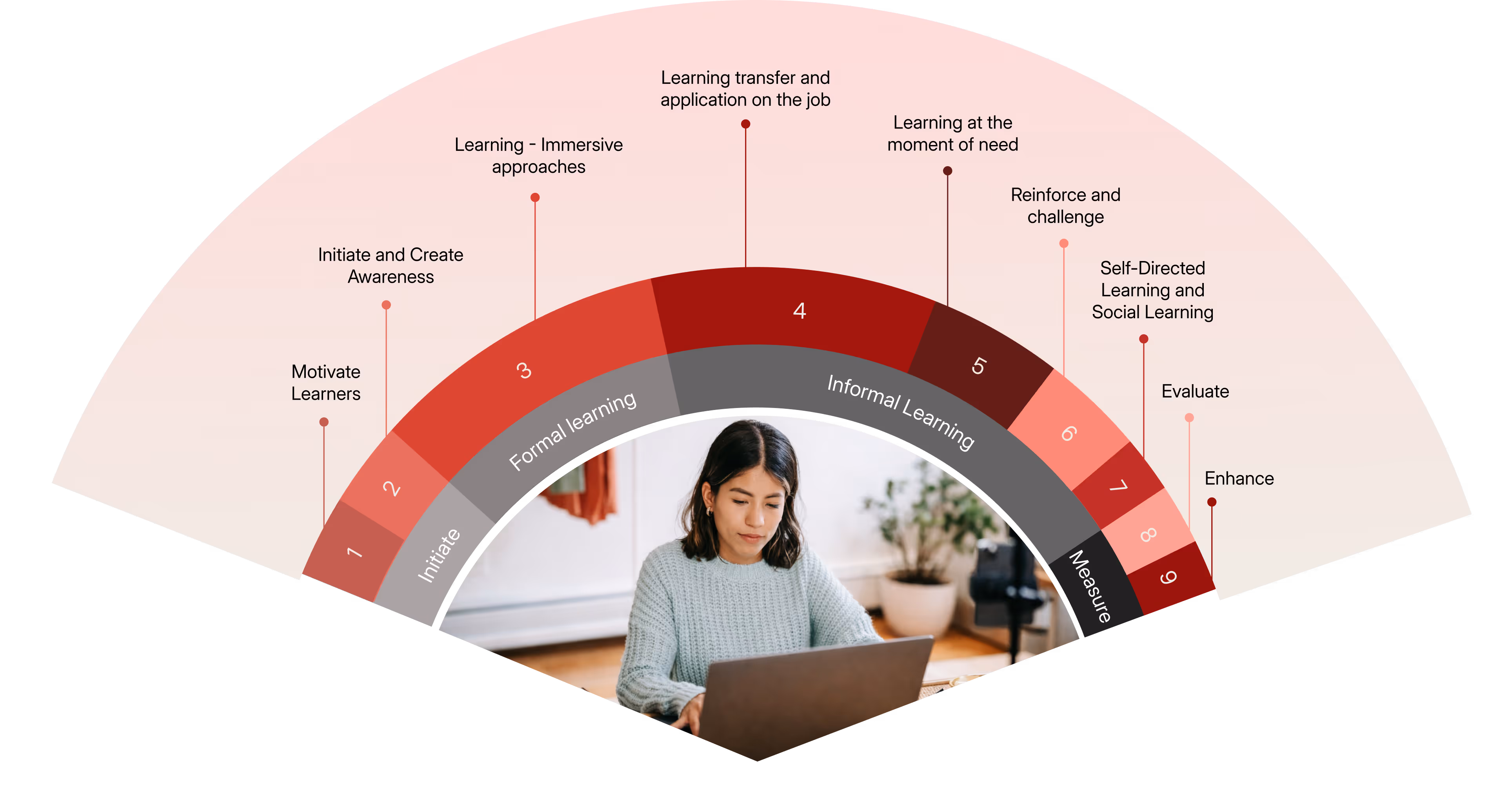 Comprehensive 9-phase ecosystem combining formal learning, informal learning, performance support, and continuous measurement for sustained performance improvement.